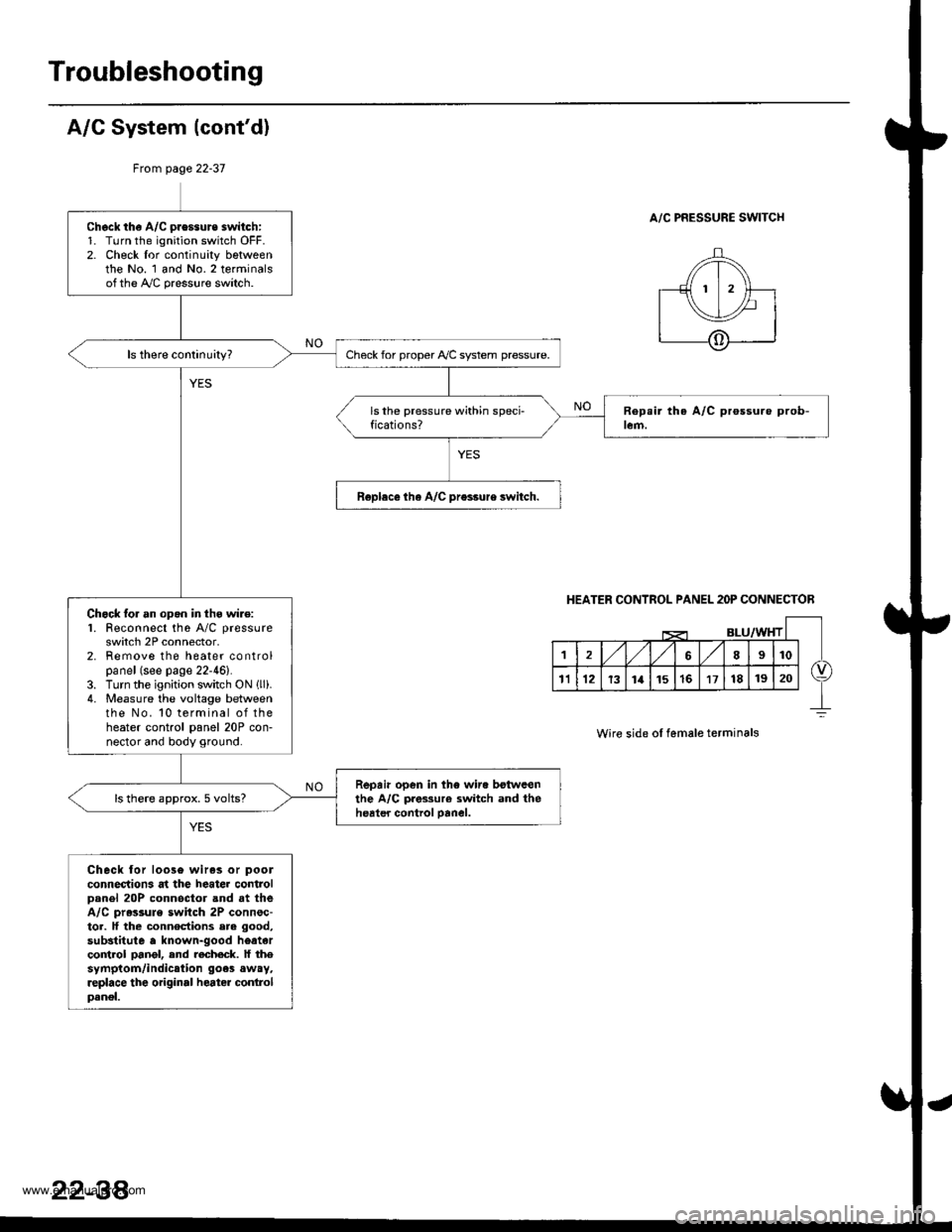 Ch6ck lor .n open in the wire:1. Disconnect the A,/C pressureswitch 2P connector.2. Turn the ignition switch ON (ll).