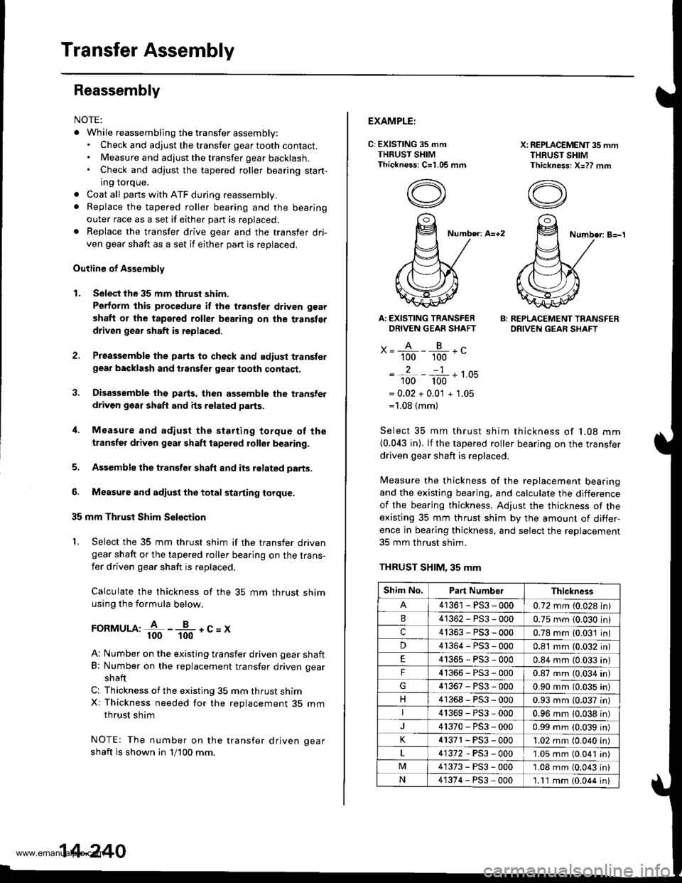 . While reassembling the transfer assembly:. Check and adjust the transfer gear tooth contact.. Measure and adjust the transfer gear backlash.. Check and adjust the