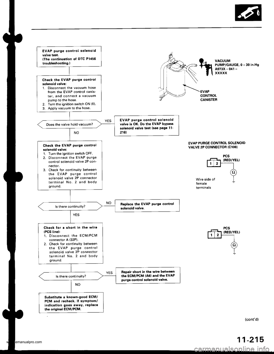 Check for the fuel tank piessureSensot:L Disconnect the hose betweenthe EVAP two way valve andthe fuel tank pressure sensor atthe EVAP two way valve end.2. Connect a vacuum pump tothe open end ofthat hose.3. Turn the ignition switch ON (lll.4. Monitor the FTP S€nsor volt-age with the Honda PGMTester, or measure voltagebetween ECNI/PCNI connectorterminals A29 and C18, andcarefully appiy vacuum on thehose one stroke at a time.5. The voltage should smoothlydrop from the staning approx.2.5 V down to approx. 1.5 V.STOP applying vacuum whenthe voltage drops to approx.1.5 V or damage to the tueltank pressure sensor may