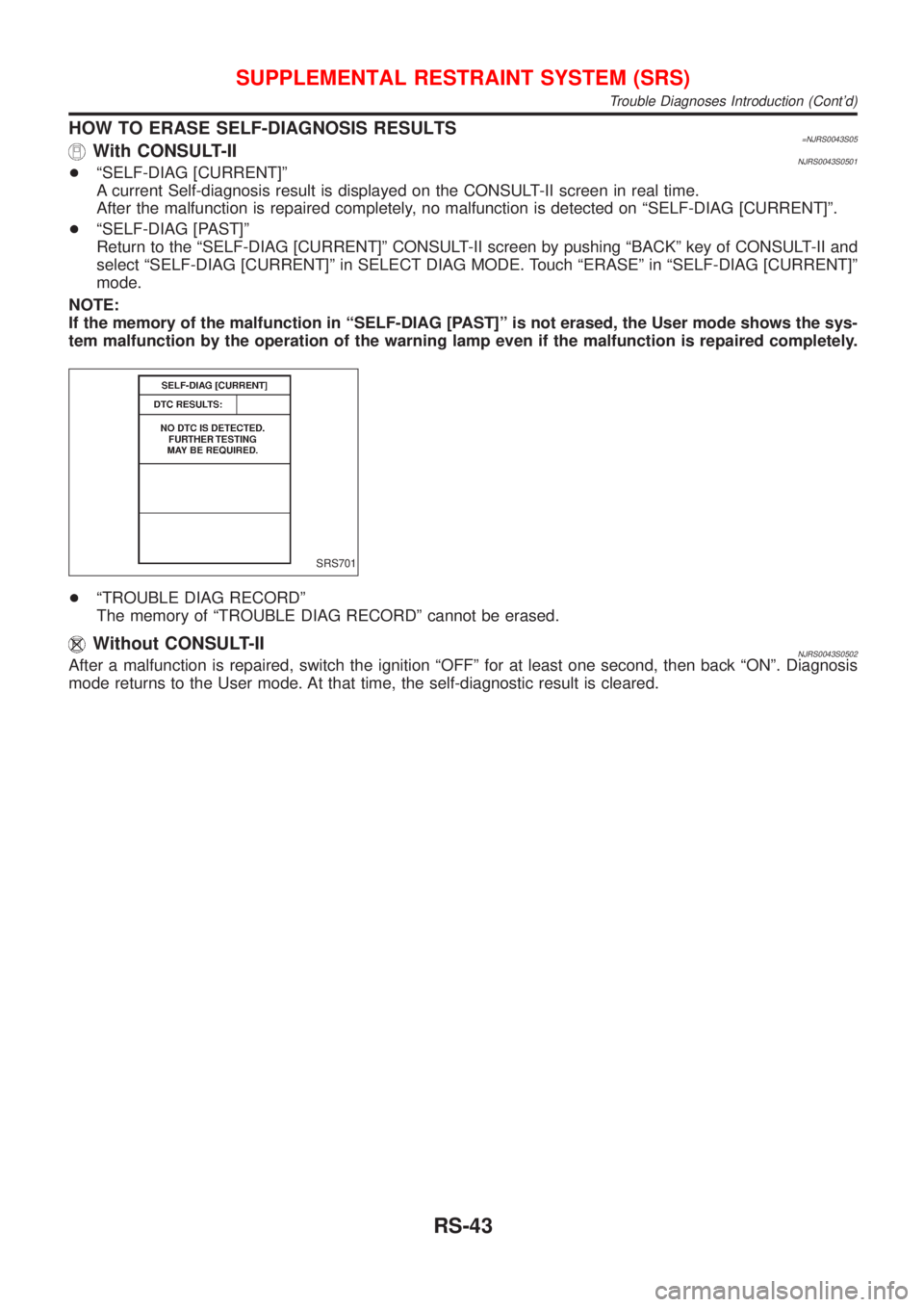 ![NISSAN ALMERA N16 2001 Electronic Repair Manual HOW TO ERASE SELF-DIAGNOSIS RESULTS=NJRS0043S05With CONSULT-IINJRS0043S0501+ªSELF-DIAG [CURRENT]º