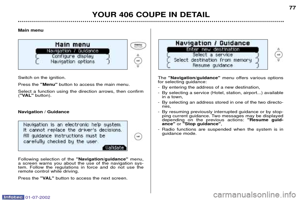 a screen warns you about the use of the navigation sys- tem. Follow the regulations in force and do not use theremote control while driving. Press the "VAL"button to access the next screen.