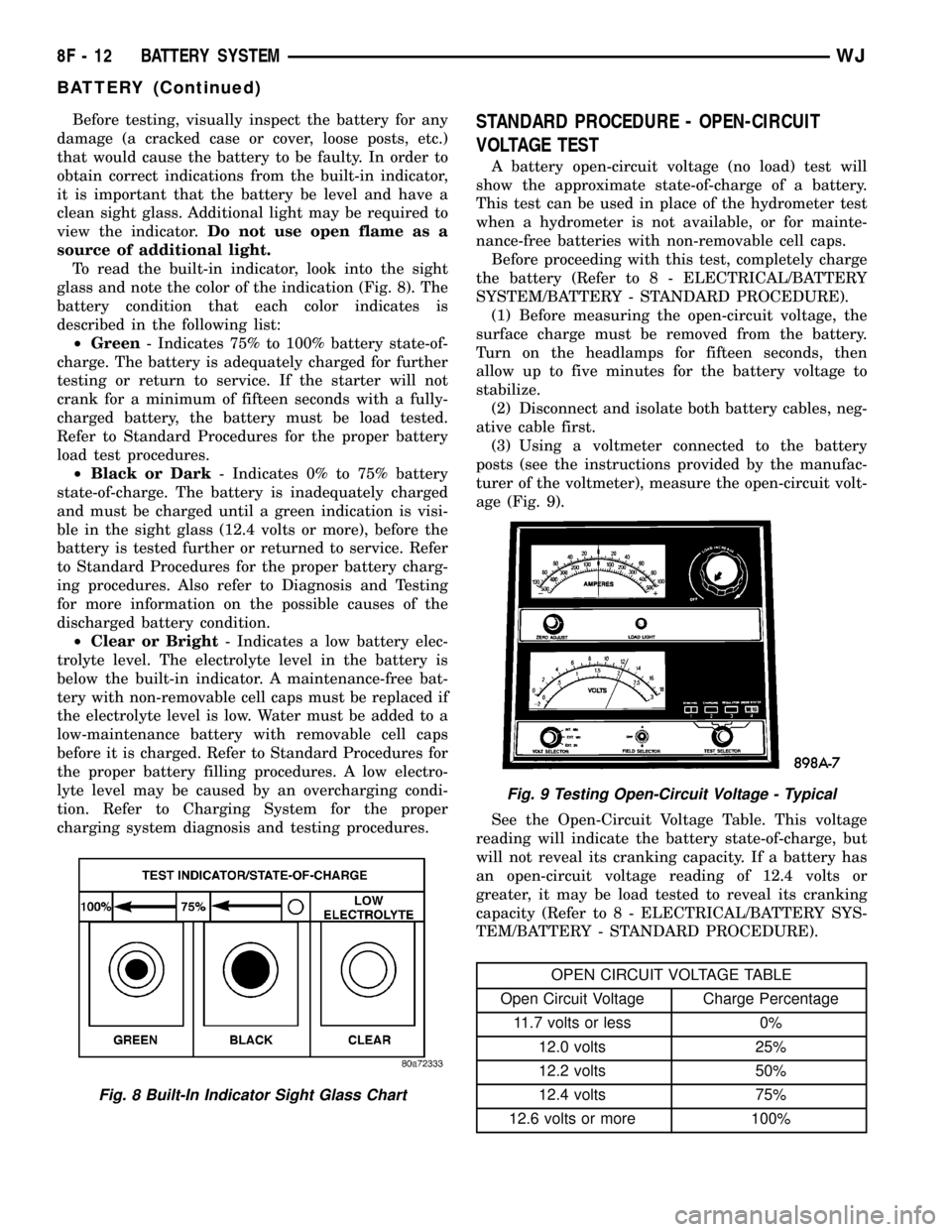 JEEP GRAND CHEROKEE 2003 WJ / 2.G Workshop Manual Before testing, visually inspect the battery for any