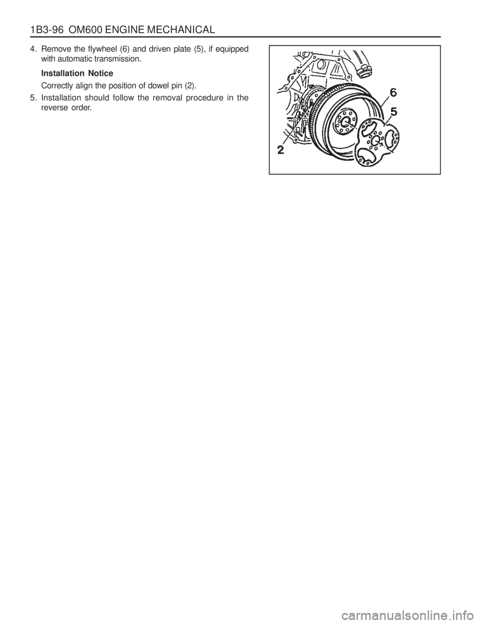 4. Remove the flywheel (6) and driven plate (5), if equippedwith automatic transmission. Installation Notice Correctly align the position of dowel pin (2).