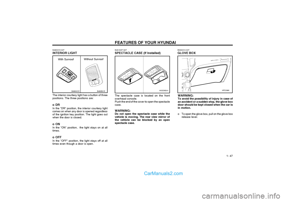 The spectacle case is located on the front overhead console.Push the end of the cover to open the spectaclecase. WARNING: Do not open the spectacle case while thevehicle is moving. The rear view mirror ofthe vehicle can be blocked by an openspectacle case.