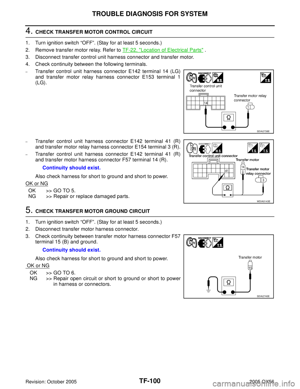5. If NG, replace transfer motor relay. Refer to TF-22, "