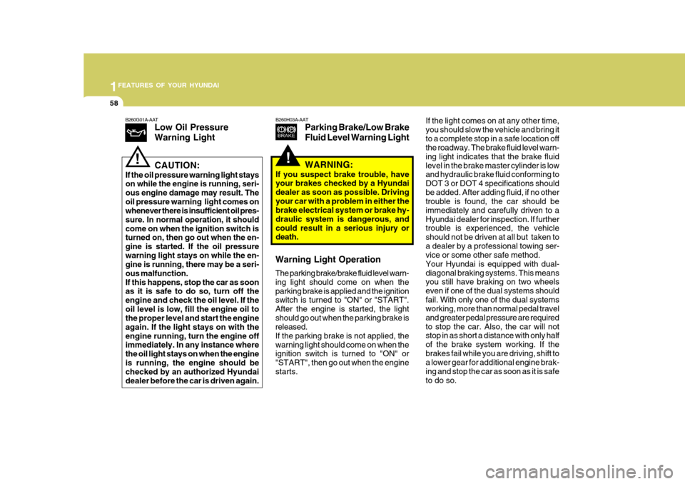 Warning Light Operation The parking brake/brake fluid level warn- ing light should come on when theparking brake is applied and the ignition switch is turned to "ON" or "START". After the engine is started, the lightshould go out when the parking brake is released. If the parking brake is not applied, thewarning light should come on when the ignition switch is turned to "ON" or "START", then go out when the enginestarts. If the light comes on at any other time,you should slow the vehicle and bring itto a complete stop in a safe location off the roadway. The brake fluid level warn- ing light indicates that the brake fluidlevel in the brake master cylinder is low and hydraulic brake fluid conforming to DOT 3 or DOT 4 specifications shouldbe added. After adding fluid, if no other trouble is found, the car should be immediately and carefully driven to aHyundai dealer for inspection. If further trouble is experienced, the vehicle should not be driven at all but taken toa dealer by a professional towing ser- vice or some other safe method. Your Hyundai is equipped with dual-diagonal braking systems. This means you still have braking on two wheels even if one of the dual systems shouldfail. With only one of the dual systems working, more than normal pedal travel and greater pedal pressure are requiredto stop the car. Also, the car will not stop in as short a distance with only half of the brake system working. If thebrakes fail while you are driving, shift to a lower gear for additional engine brak- ing and stop the car as soon as it is safeto do so.