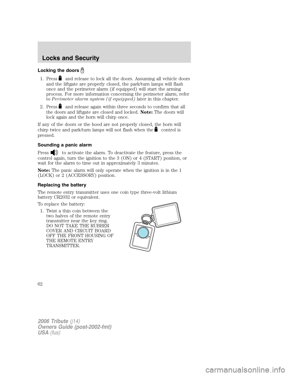 The remote entry transmitter uses one coin type three-volt lithium