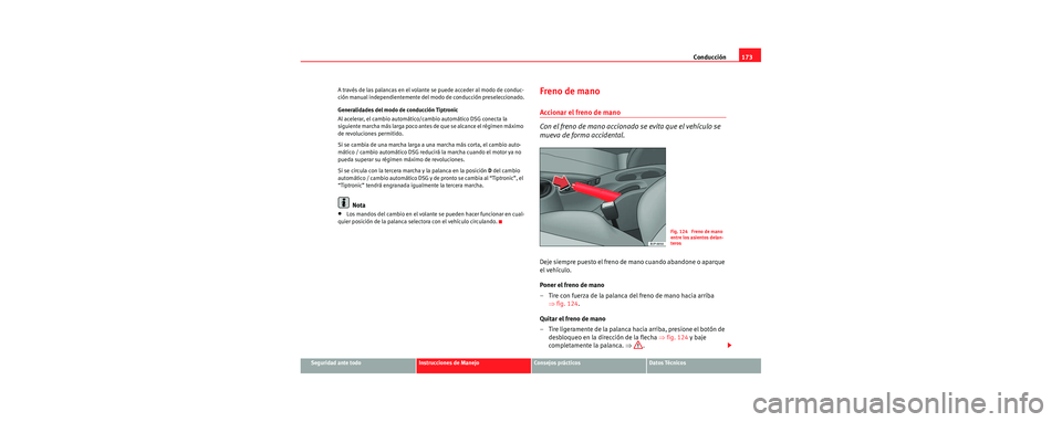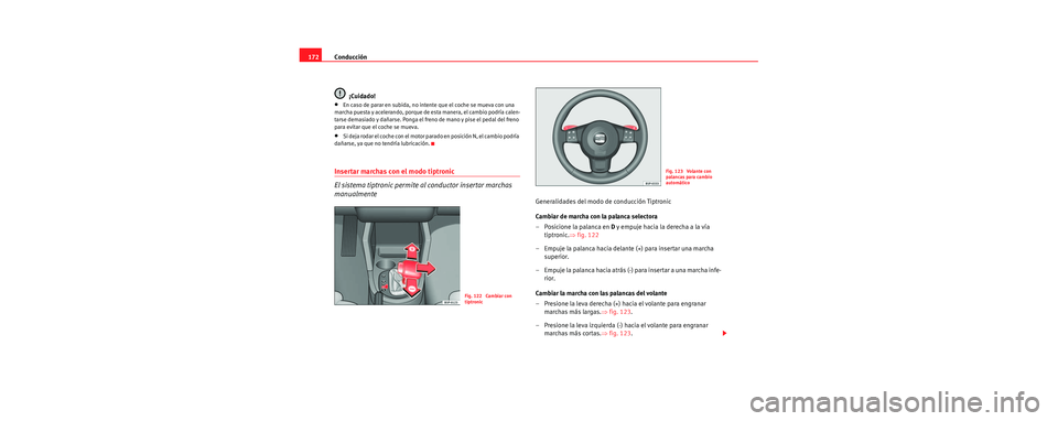 – Presione la leva derecha (+) hacia el volante para engranar marchas más largas. ⇒fig. 123.