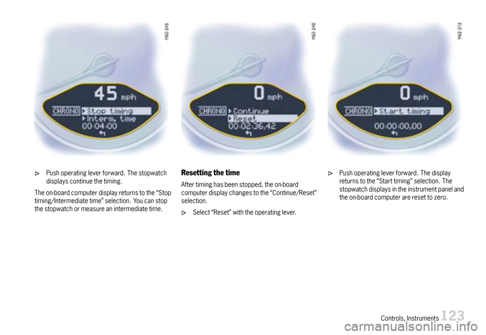 Pushoperatingleverforward.Thedisplayreturnstothe“Starttiming”selection.Thestopwatchdisplaysintheinstrumentpanelandtheon-boardcomputerareresettozero.