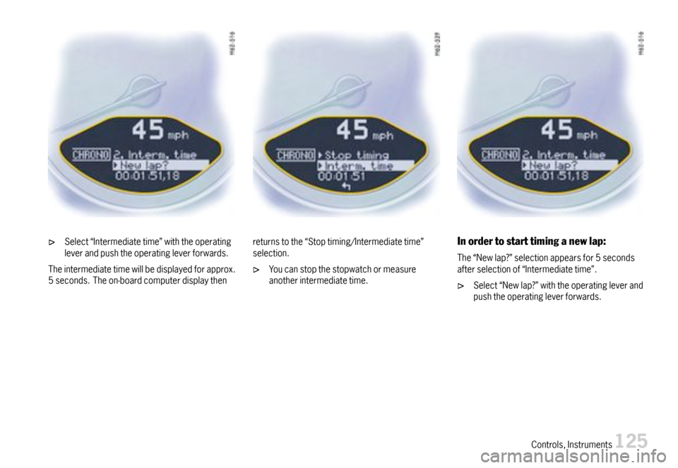 Aftertimemeasurementisstarted,theon-boardcomputerdisplaychangestothe“Stoptim-ing/Intermediatetime”.