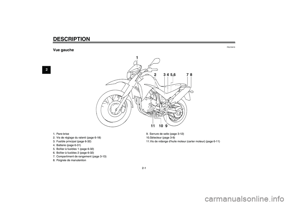 7. Poignée des gaz (page 6-19)8. Bouchon du réservoir de carburant (page 3-10)U5VKF1F0.book Page 3 Thursday, July 20, 2006 9:40 AM