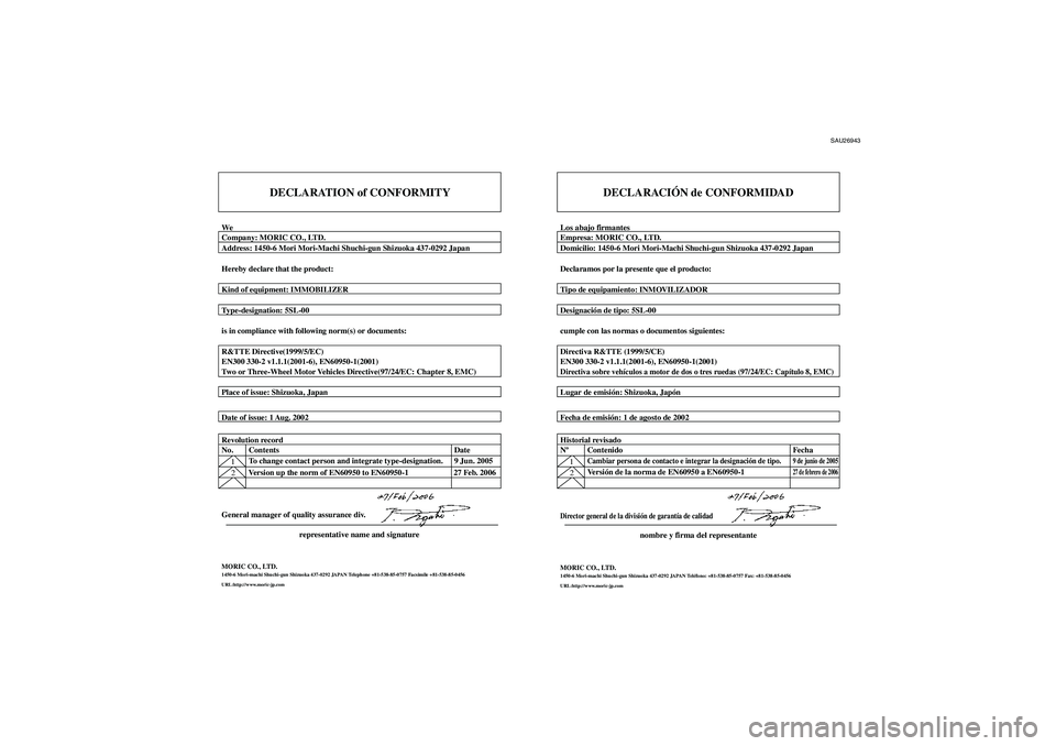 EN300 330-2 v1.1.1(2001-6), EN60950-1(2001)Directiva sobre vehículos a motor de dos o tres ruedas (97/24/EC: Capítulo 8, EMC)Lugar de emisión: Shizuoka, Japón