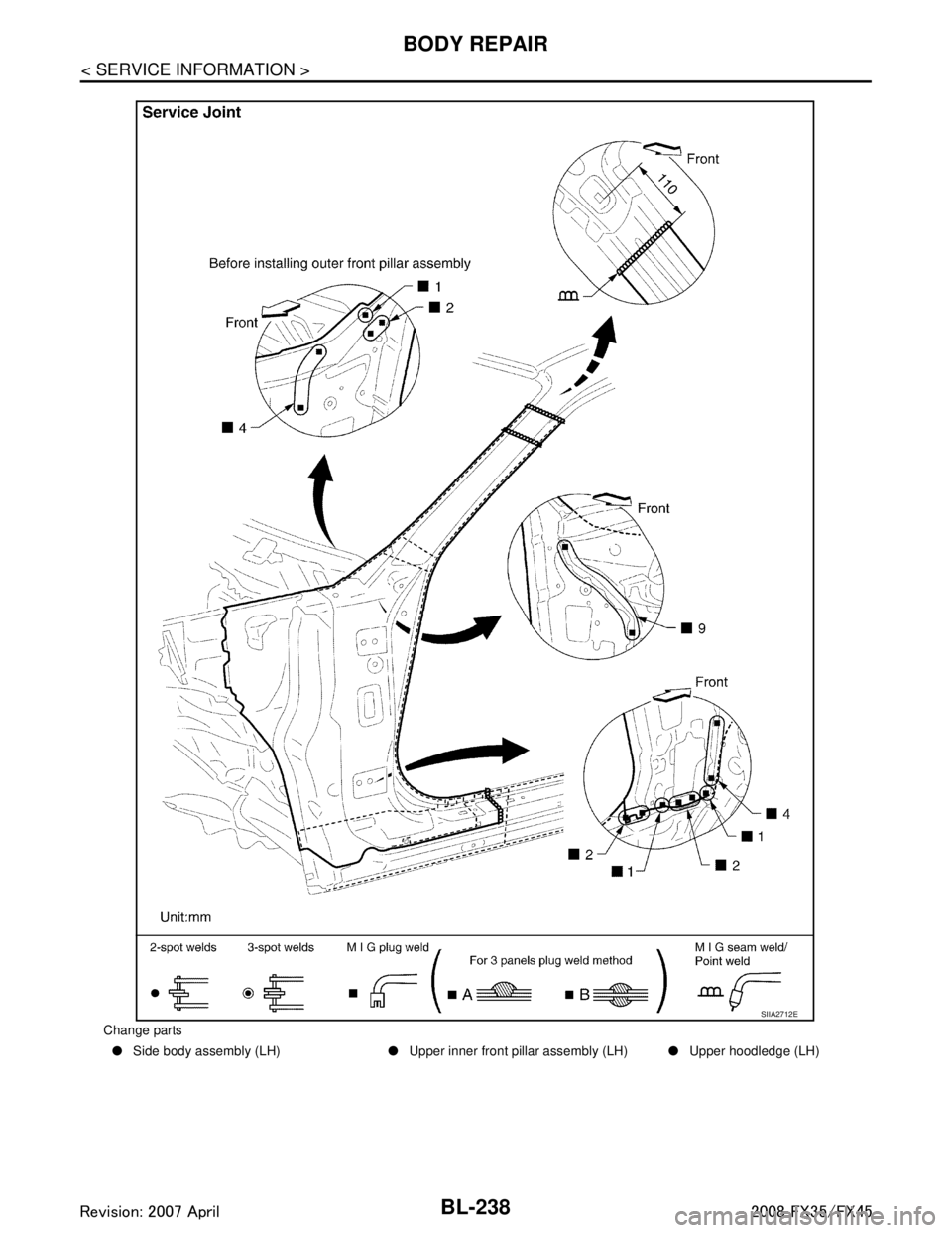 Change parts● Side body assembly (LH) ●Upper inner front pillar assembly (LH) ●Upper hoodledge (LH)
