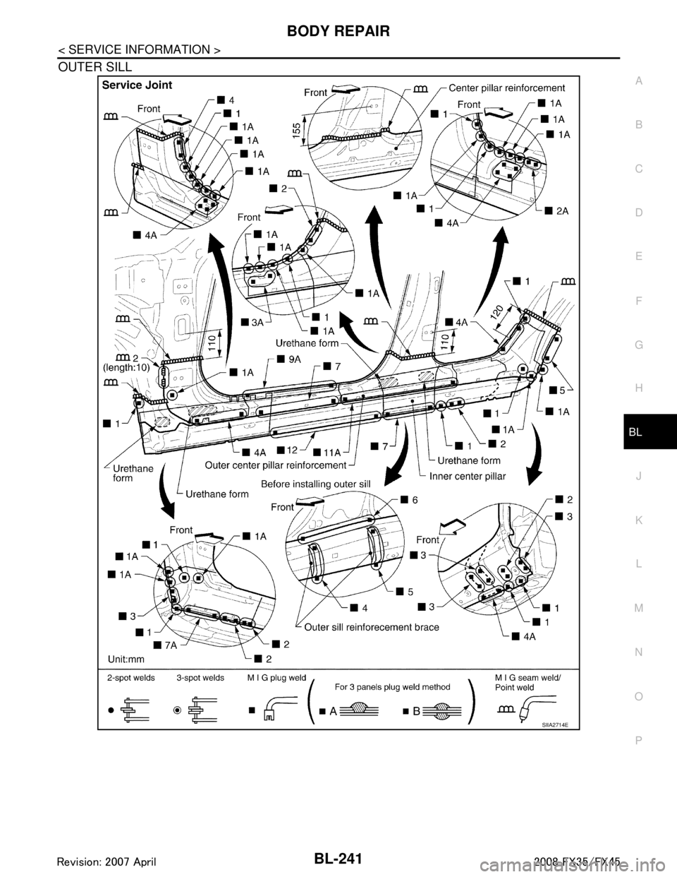 Change parts● Outer sill (LH) ●Outer sill rein forcement assembly (LH) ●Outer front pillar reinforcement (LH)