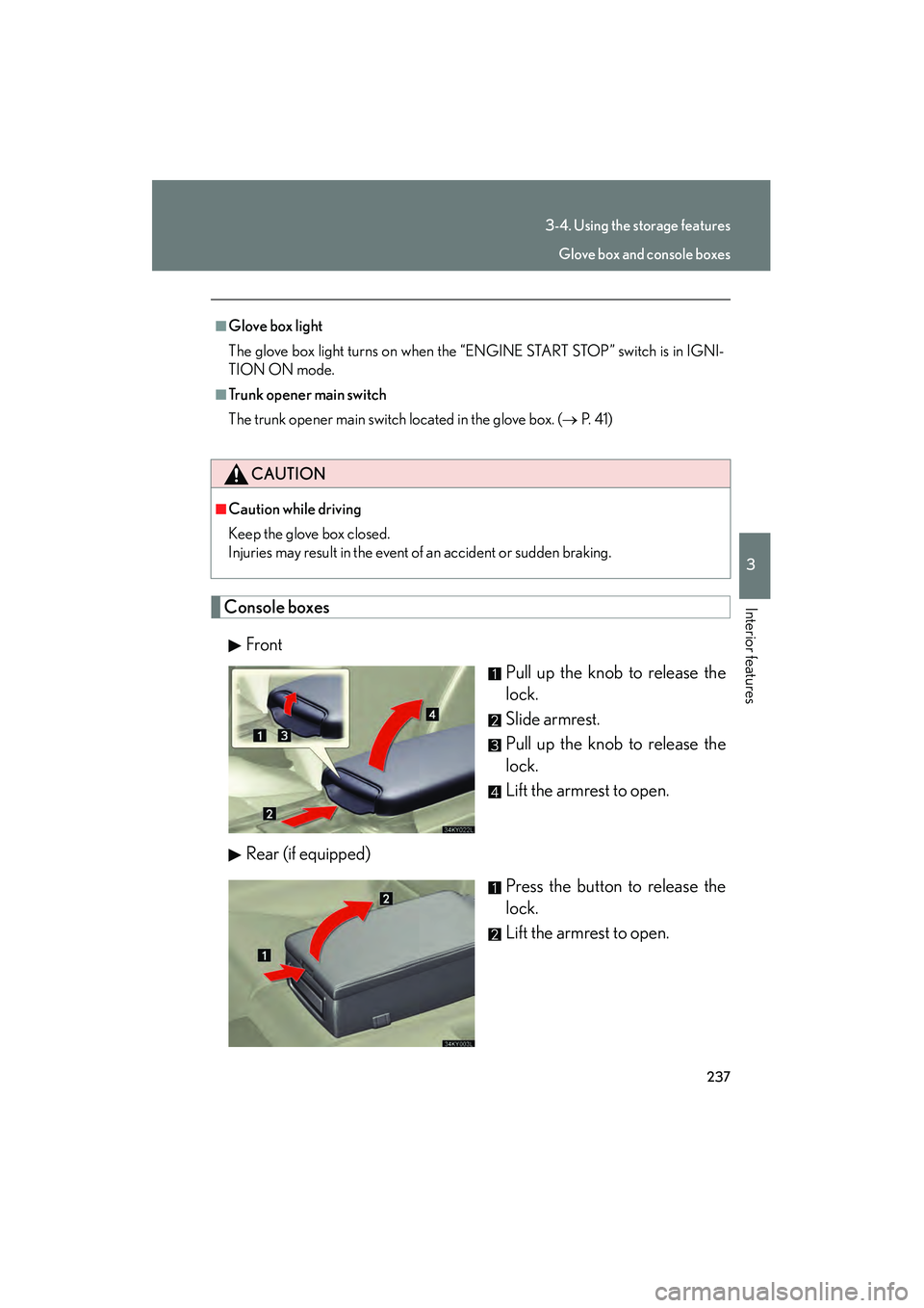 Console boxesFront Pull up the knob to release the