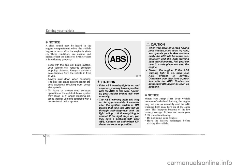 Restart the engine. If the ABS warning light is off, then yourABS system is normal.Otherwise, you may have a prob- lem with the ABS. Contact anauthorized KIA dealer as soon aspossible.