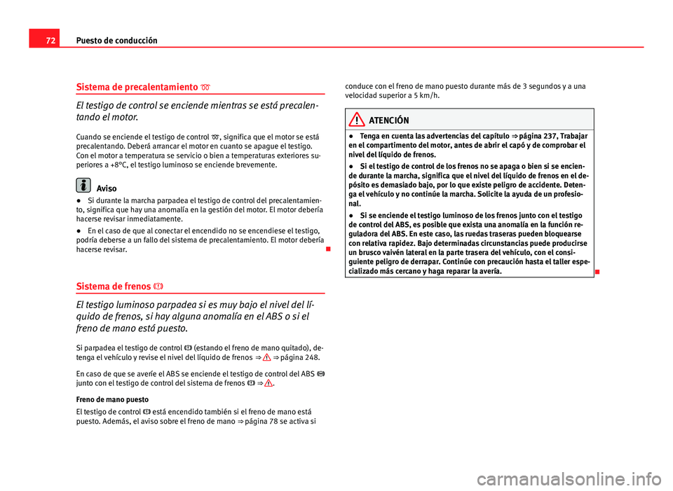 puesto. Además, el aviso sobre el freno de mano ⇒ página 78 se activa siconduce con el freno de mano puesto durante más de 3 segundos y a una