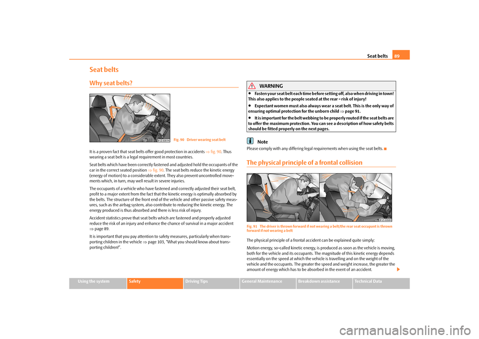Fasten your seat belt before starting!Fig. 92 Routing of webbing over the shoulders and the lap belt– Correctly adjust the front seat and the head restraint before fastening your seat belt
