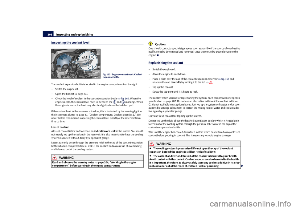 – Check the level of coolant in the coolant expansion bottle fig. 165 . When the