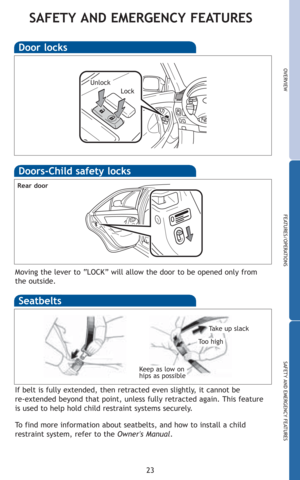 Child comfort guide 24Door locks 23Doors-Child safety locks 23Seatbelts 23Seatbelts-Shoulder belt anchor 24Spare tire & tools 25Tire Pressure Monitoring (warning) System 24