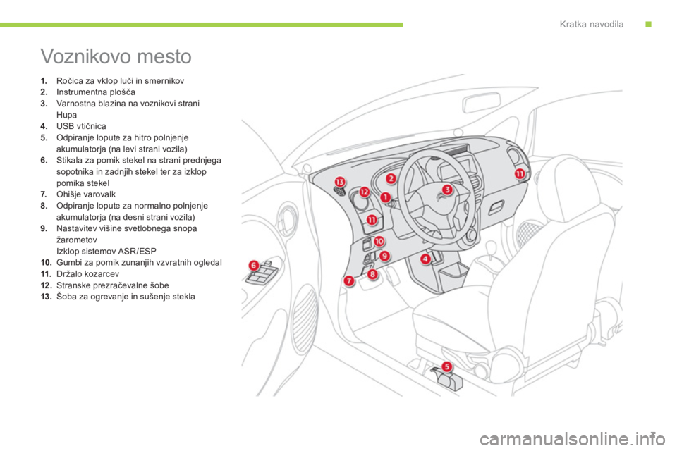 7. Ohišje varovalk 8.Odpiranje lopute za normalno polnjenjeakumulatorja (na desni strani vozila)9.