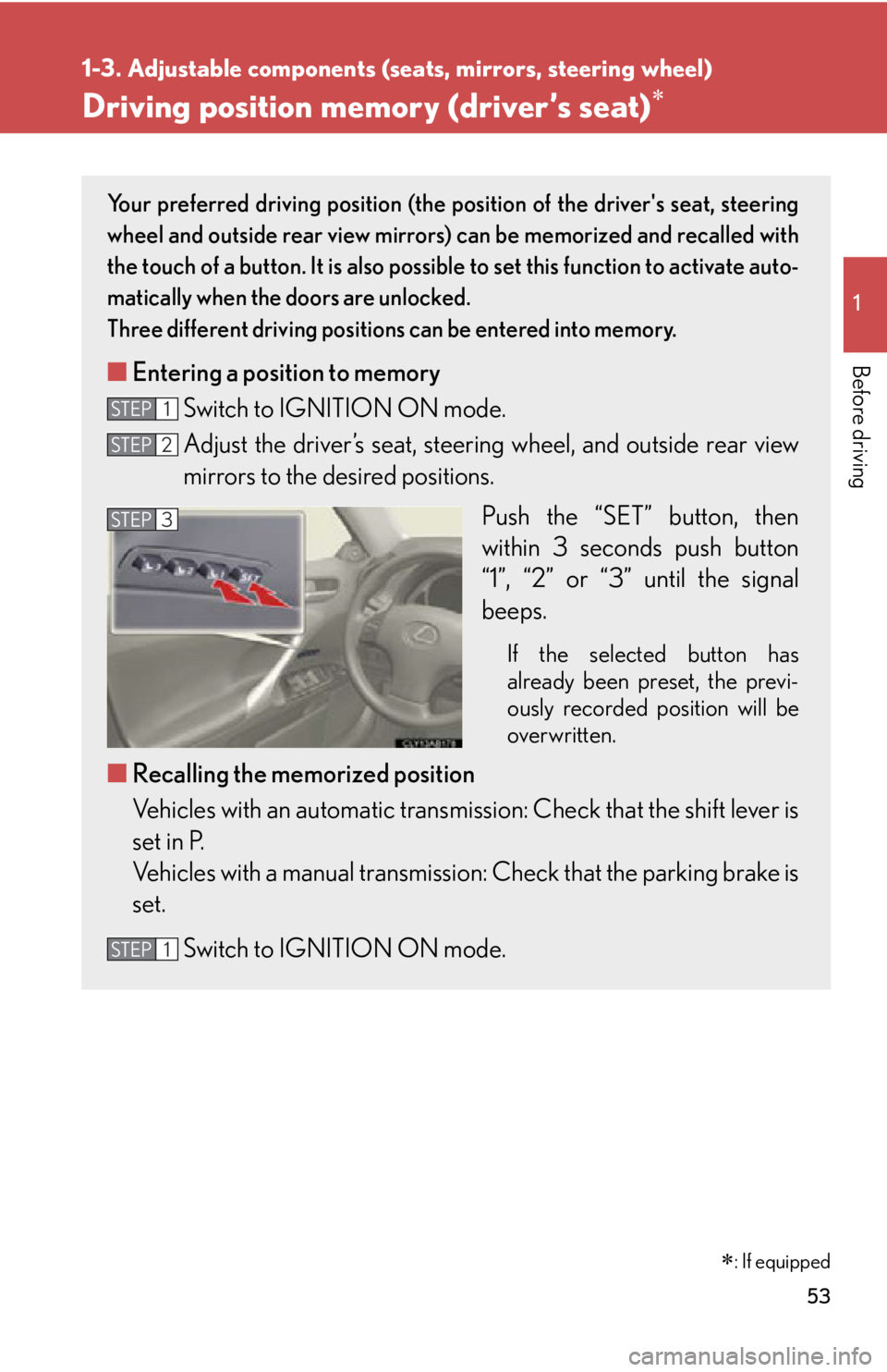 Record your driving position to butto n “1”, “2” or “3” before performing