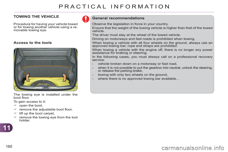 Temporary puncture repair kit 135Changing a wheel 140Changing a bulb 144Changing a fuse 150Battery 157Energy economy mode 159Changing a wiper blade 159Towing the vehicle 160Towing a trailer 162Fitting roof bars 163Accessories 164