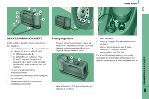Batteri 124Hjulskift 126Dekkreparasjonssett 129Skifte en lyspære 131Skifte sikring 135Skifte vindusviskerblader 139Tauing 140