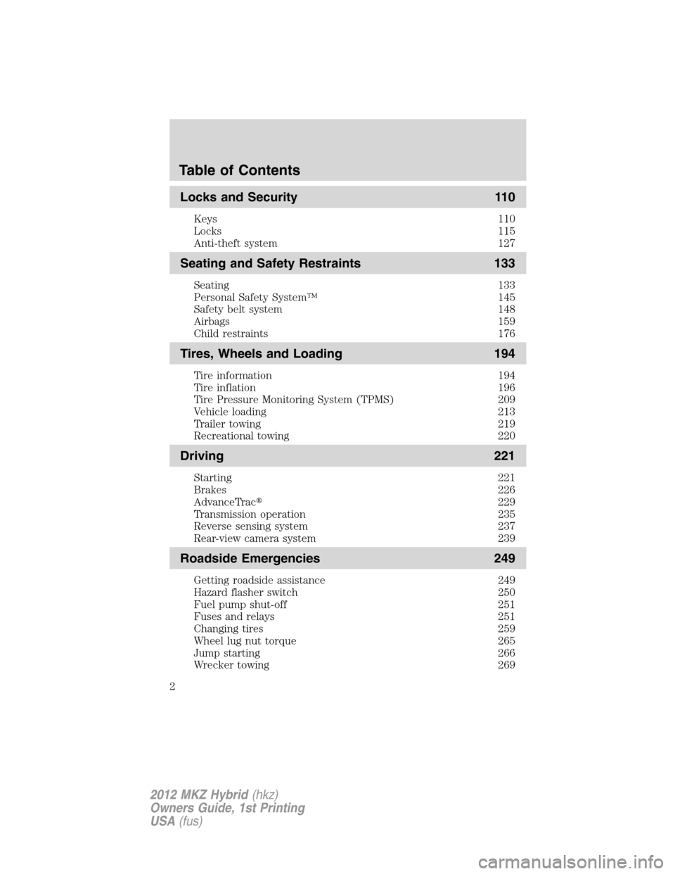 LINCOLN MKZ HYBRID 2012  Owners Manual Locks and Security 110