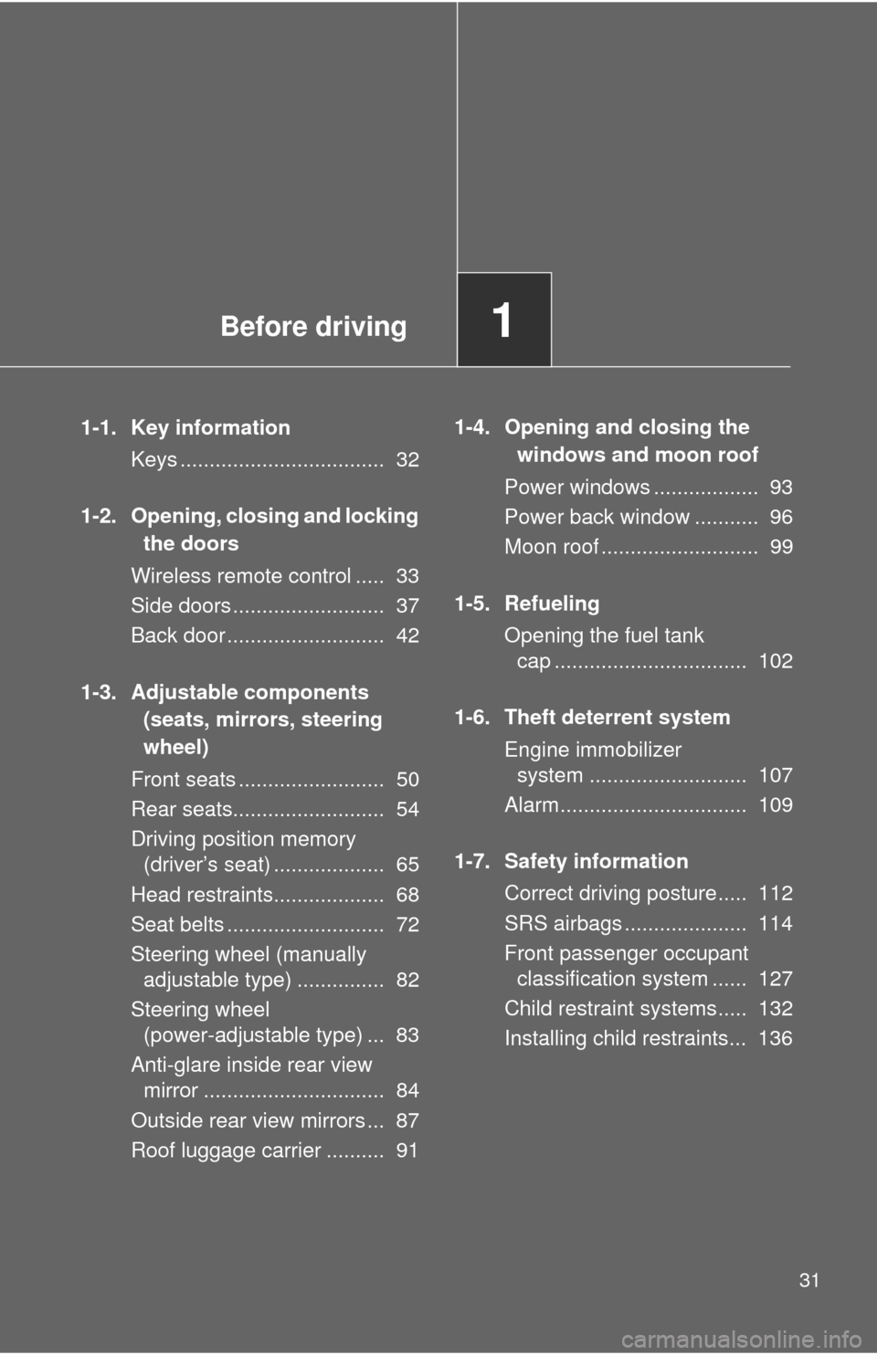 Roof luggage carrier .......... 91 1-4. Opening and closing the