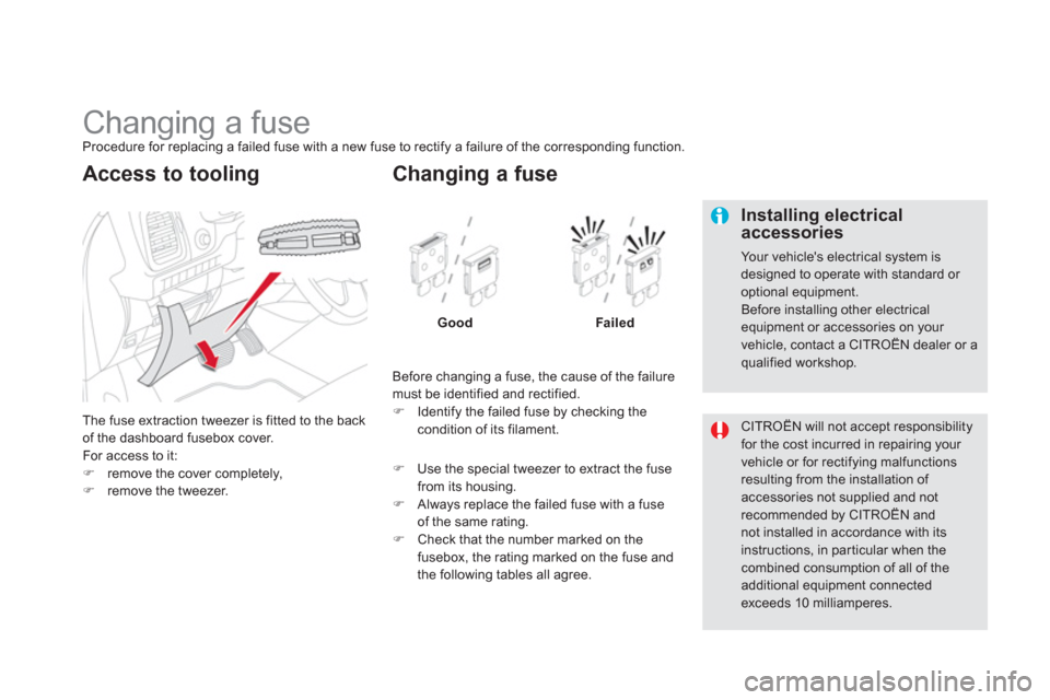 CITROËN will not accept responsibilityfor the cost incurred in repairing your vehicle or for rectifying malfunctions resulting from the installation of accessories not supplied and notrecommended by CITROËN andnot installed in accordance with its instructions, in par ticular when thecombined consumption of all of the additional equipment connectedexceeds 10 milliamperes.
