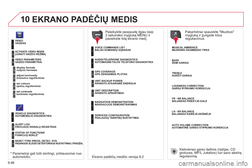 Patikrinkite, ar garso reguliavimo nustatymai(garso stiprumo, žemų ir aukštų garsų, garsinėsaplinkos, garso ryškumo) pritaikyti prie klausomo garso šaltinio. Patartina AUDIO funkcijas (žemusir aukštus garsus, balansą priekyje/gale, balansą kairėje/dešinėje) nustatyti į vidurinę padėtį ir pasirinkti "neutralią" garsinę aplinką, o garsų ryškumo korekciją įjungti, kai grojamas CD, ir išjungti, kai klausomasi radijo.