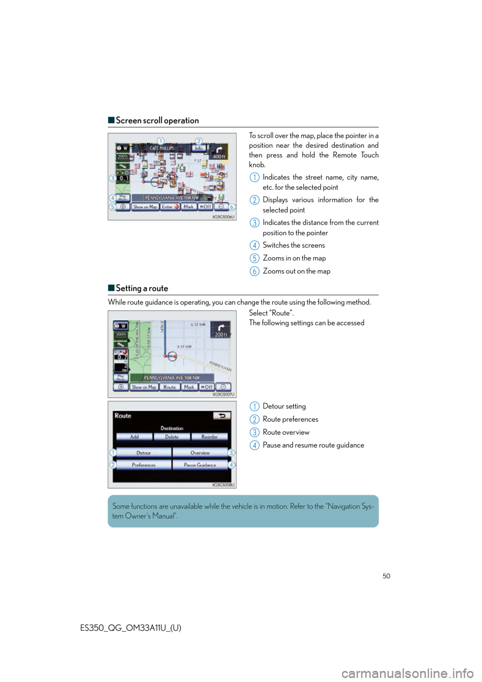 Some functions are unavailable while the vehicl e is in motion. Refer to the “Navigation Sys-