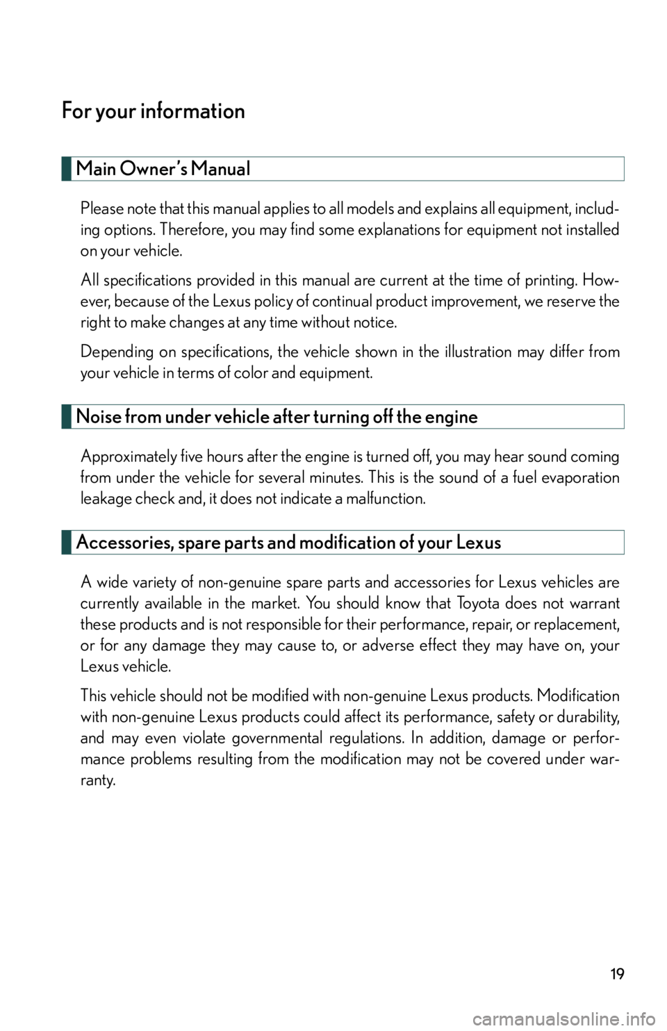 This vehicle should not be modified with non-genuine Lexus products. Modification
