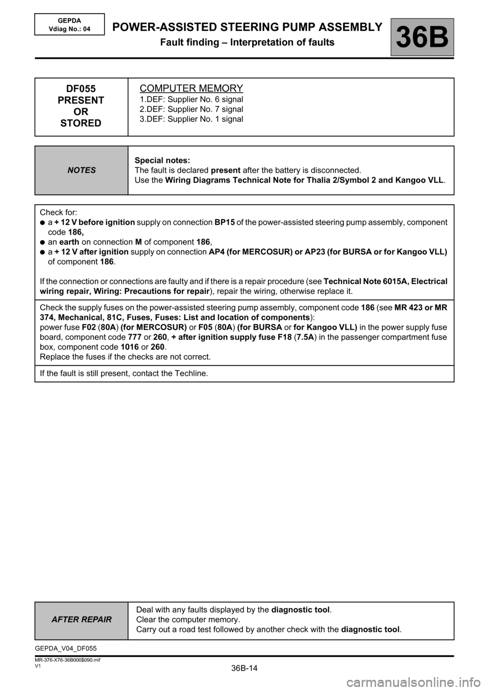 Kangoo VLL) on the power-assisted steering pump assembly, component code 186 (see MR 423 or MR 374,