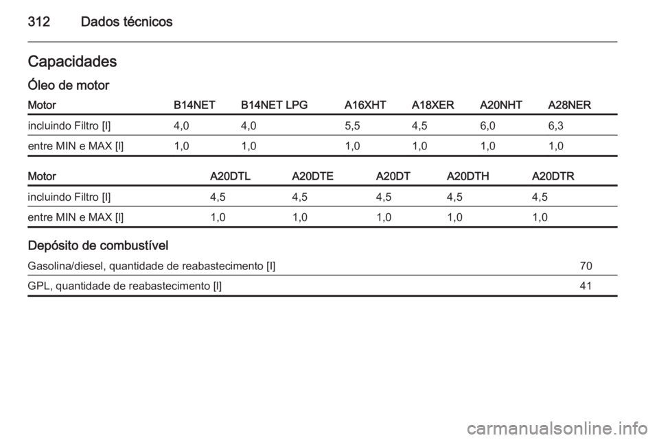 312Dados técnicosCapacidadesÓleo de motorMotorB14NETB14NET LPGA16XHTA18XERA20NHTA28NERincluindo Filtro [I]4,04,05,54,56,06,3entre MIN e MAX [l]1,01,01,01,01,01,0MotorA20DTLA20DTEA20DTA20DTHA20DTRincluindo Filtro [I]4,54,54,54,54,5entre MIN e MAX [l]1,01,01,01,01,0