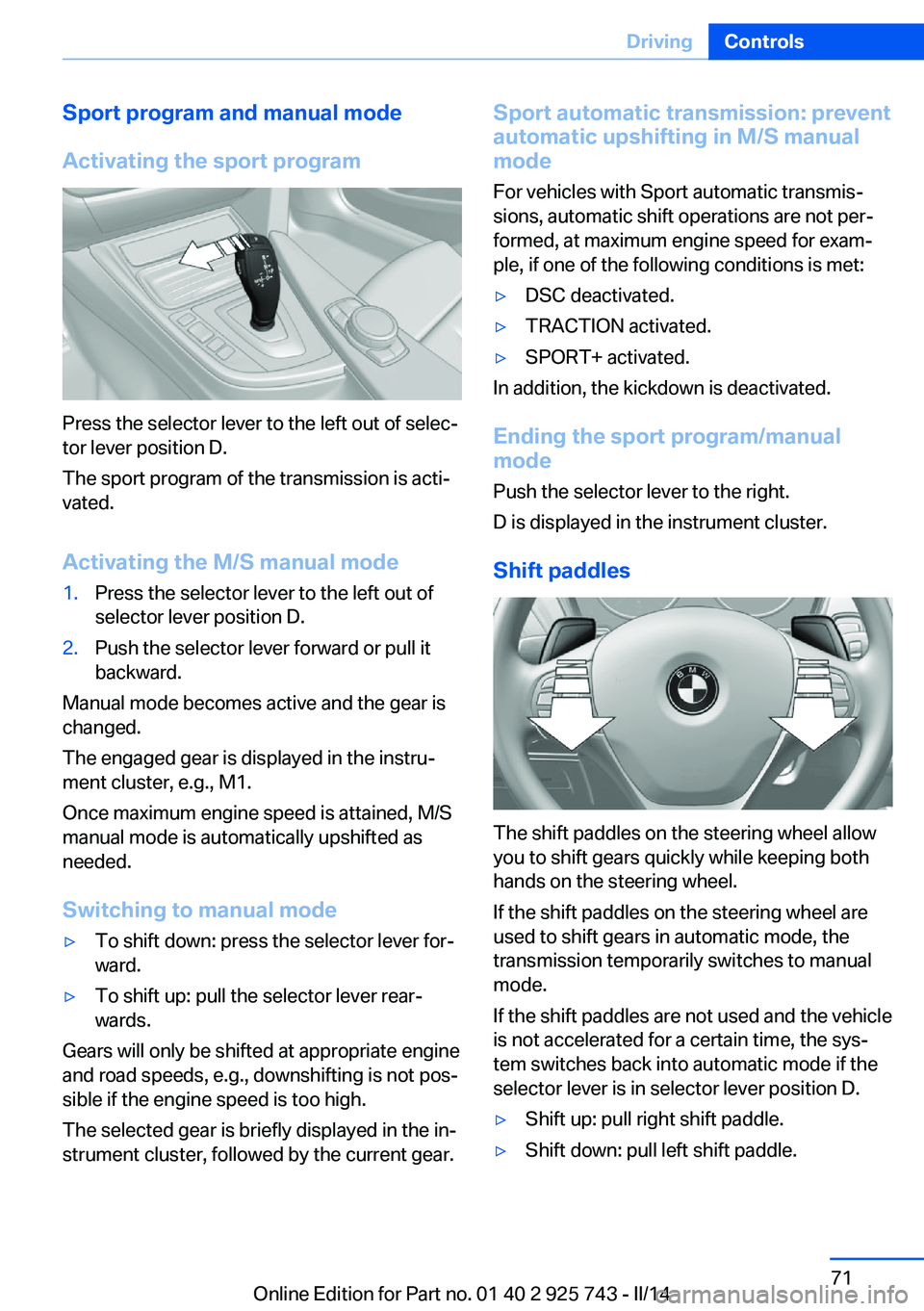 BMW 320I XDRIVE 2014  Owners Manual Sport program and manual mode