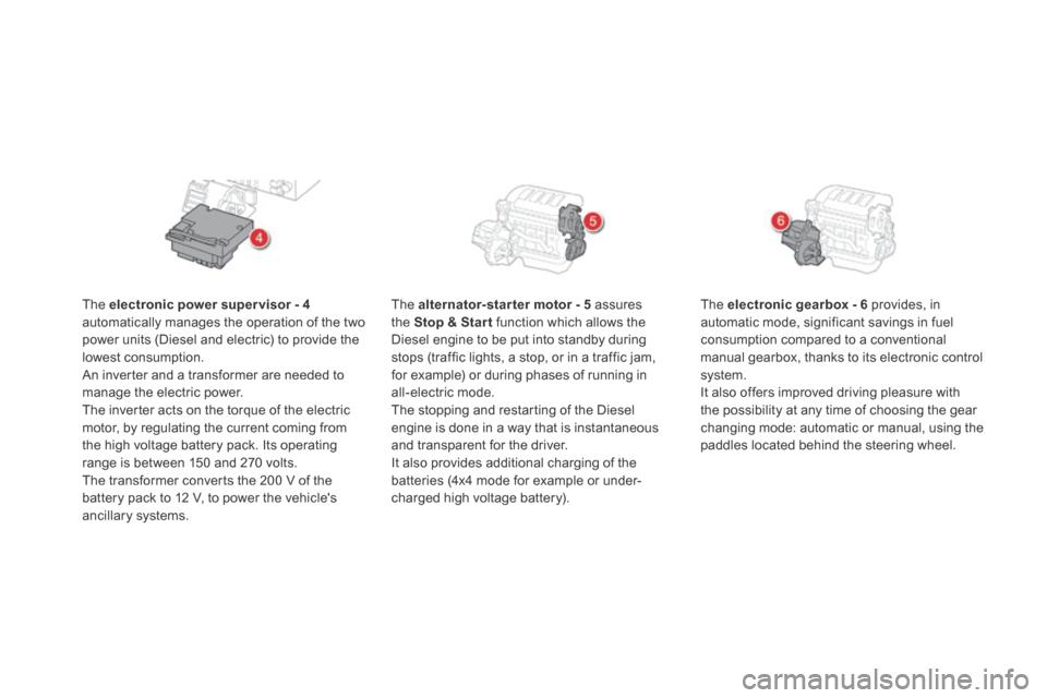 The alternator-starter motor - 5 assures the Stop & Star t function which allows the Diesel engine to be put into standby during stops (traffic lights, a stop, or in a traffic jam, for example) or during phases of running in all-electric mode. The stopping and restarting of the Diesel engine is done in a way that is instantaneous and transparent for the driver. It also provides additional charging of the batteries (4x4 mode for example or under-charged high voltage battery).