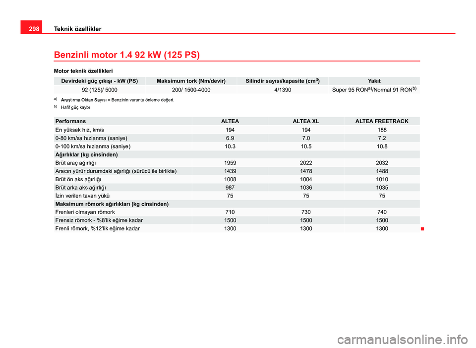 PerformansALTEAALTEA XLEn yüksek hız, km/s1841840-80 km/sa hızlanma (saniye)7.37.50-100 km/sa hızlanma (saniye)11.311.6Ağırlıklar (kg cinsinden)Brüt araç ağırlığı18801939Aracın yürür durumdaki ağırlığı (sürücü ile birlikte)13601395Brüt ön aks ağırlığı970980Brüt arka aks ağırlığı9801025İzin verilen tavan yükü7575Maksimum römork ağırlıkları (kg cinsinden)Frenleri olmayan römork680690Frensiz römork - %8’lik eğime kadar15001500Frenli römork, %12’lik eğime kadar12001200