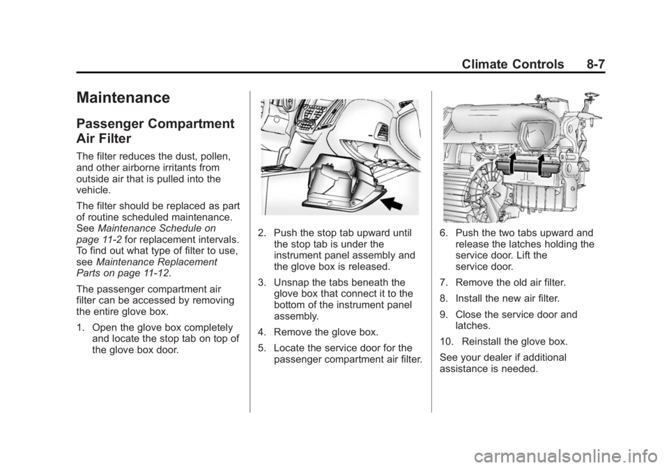 5. Locate the service door for the passenger compartment air filter.6. Push the two tabs upward andrelease the latches holding the