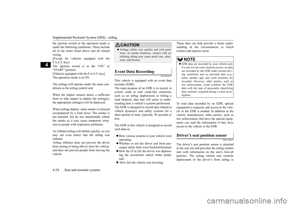 • The SRS warning light does not initiallycome on when the ignition switch or theoperation mode is under the followingconditions.• [Except for vehicles equipped with theF. A . S . T. - k e y ] The ignition switch is in the “ON” or “START” position.[Vehicles equipped with the F.A.S.T.-key] The operation mode is in ON.• The SRS warning light does not go outafter several seconds.• The SRS warning li