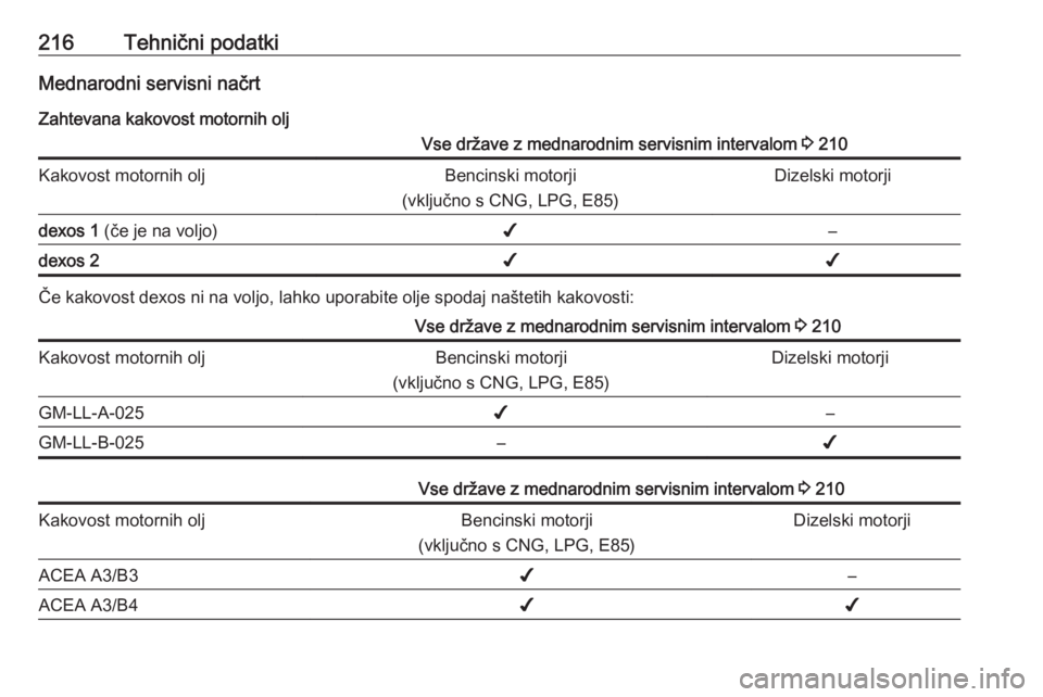 (vključno s CNG, LPG, E85)Dizelski motorjiGM-LL-A-025✔–GM-LL-B-025–✔Vse države z mednarodnim servisnim intervalom 3 210Kakovost motornih oljBencinski motorji