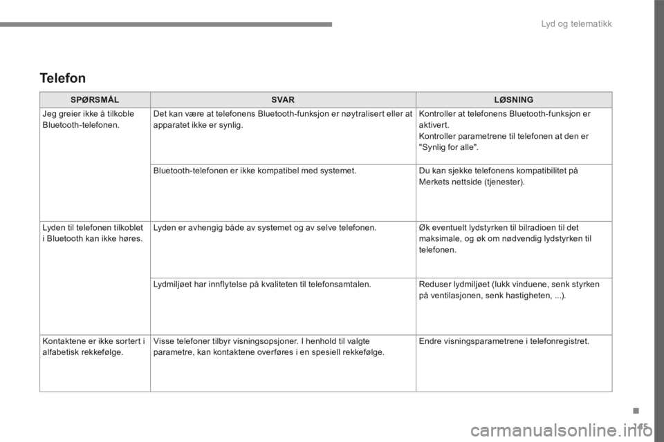 Jeg greier ikke å tilkoble Bluetooth-telefonen. Det kan være at telefonens Bluetooth-funksjon er nøytralisert eller at apparatet ikke er synlig. Kontroller at telefonens Bluetooth-funksjon er aktivert. Kontroller parametrene til telefonen at den er "Synlig for alle".