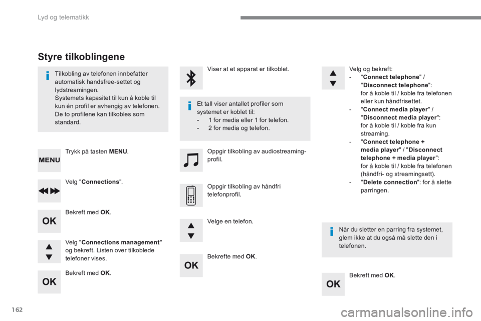 Velg og bekreft: - " Connect telephone " / " Disconnect telephone ": for å koble til / koble fra telefonen eller kun håndfrisettet. - " Connect media player " / " Disconnect media player ": for å koble til / koble fra kun streaming. - " Connect telephone + media player " / " Disconnect telephone + media player ": for å koble til / koble fra telefonen (håndfri- og streamingsett). - " Delete connection ": for å slette parringen.