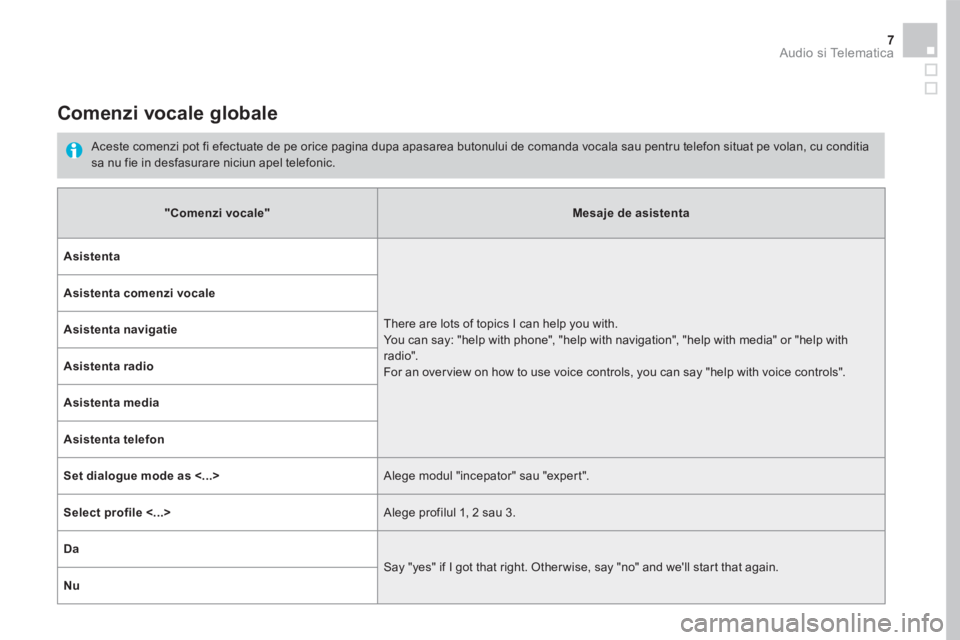 Aceste comenzi pot fi efectuate de pe orice pagina dupa apasarea butonului de comanda vocala sau pentru telefon situat pe volan, cu conditia sa nu fie in desfasurare niciun apel telefonic.