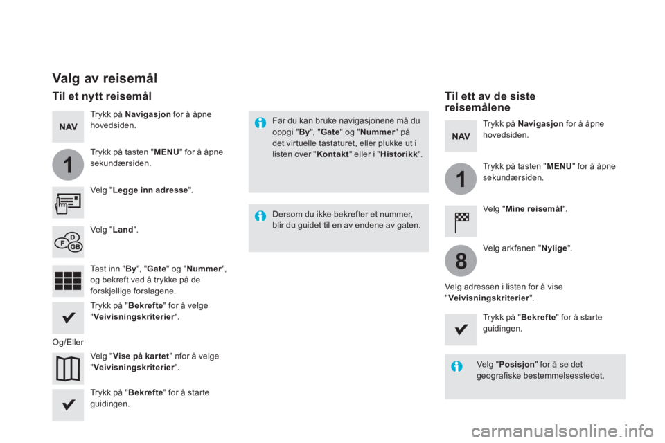 Før du kan bruke navigasjonene må du oppgi " By ", " Gate " og " Nummer " på det virtuelle tastaturet, eller plukke ut i listen over " Kontakt " eller i " Historikk ".