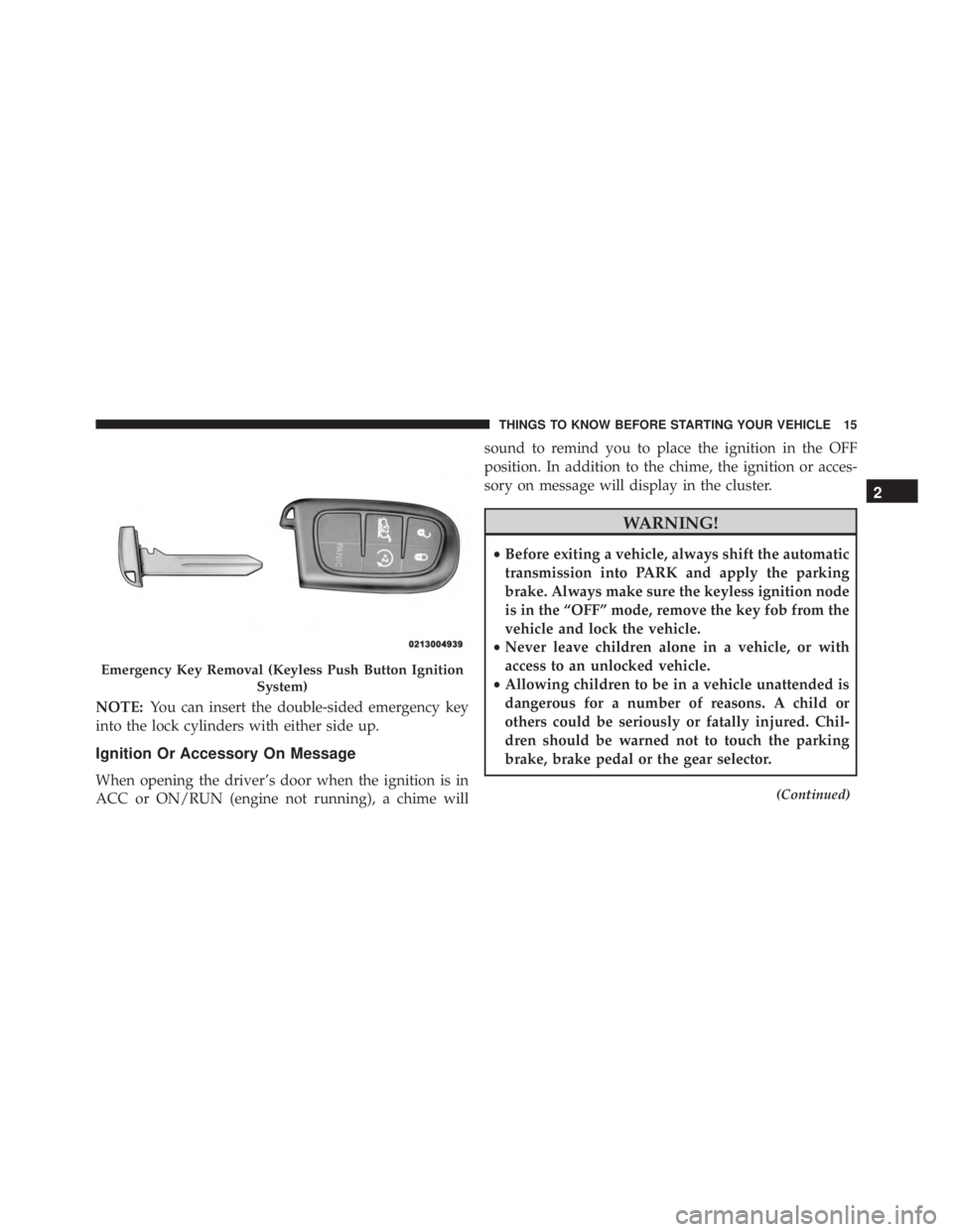 ACC or ON/RUN (engine not running), a chime will sound to remind you to place the ignition in the OFF