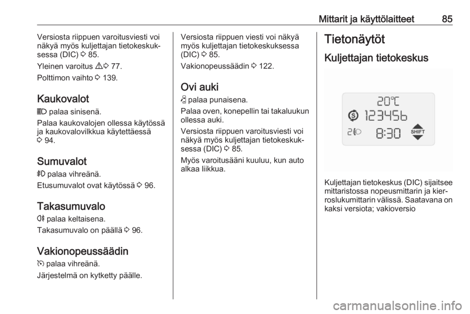 Mittarit ja käyttölaitteet85Versiosta riippuen varoitusviesti voi
