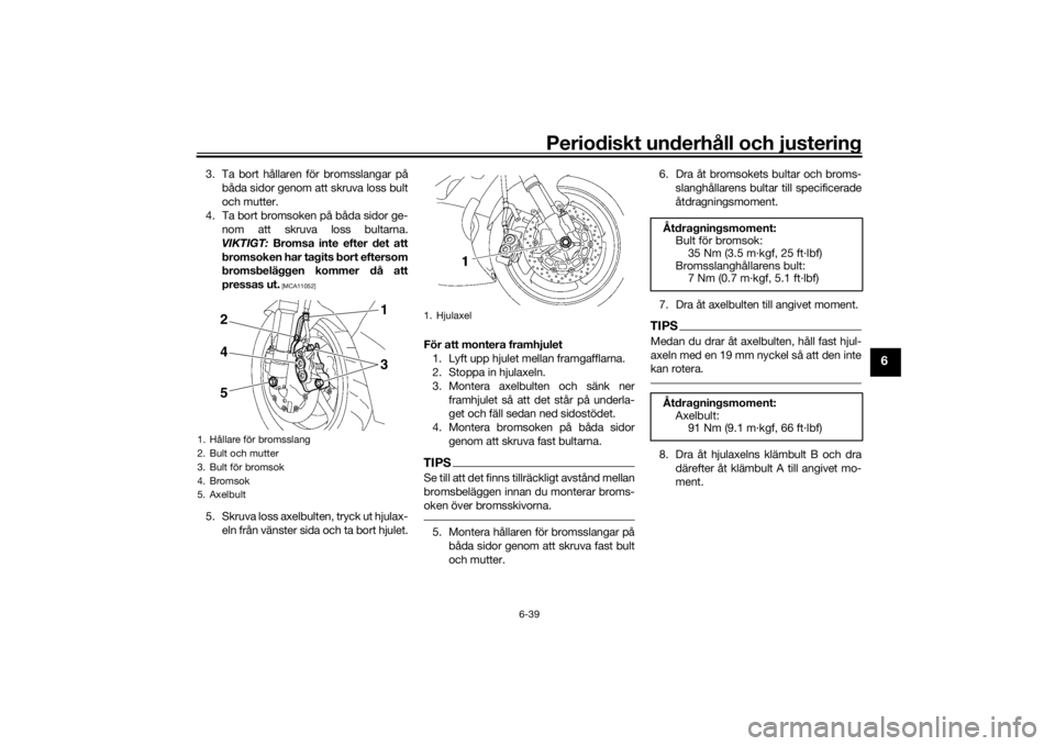 personskador.1. Lossa framhjulaxelns klämbultar, ax- elns bult och bultarna för bromsoket.