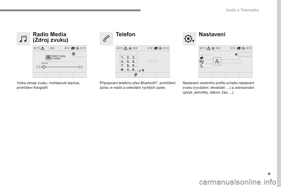 Volba zdroje zvuku, rozhlasové stanice, prohlížení fotografií. Připojování telefonu přes Bluetooth ® , prohlížení zpráv, e-mailů a odesílání rychlých zpráv.